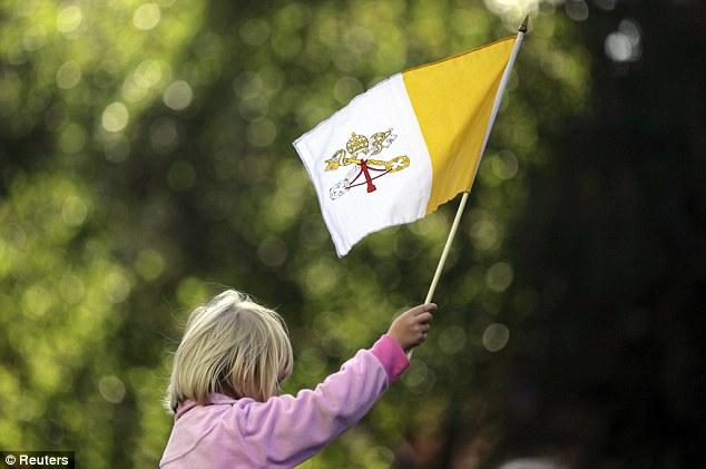 Hovering above a police helicopter kept watch. Children took to their parents' shoulders, with one youngster saying: 'Mummy, mummy, I see him, I see the Pope!'