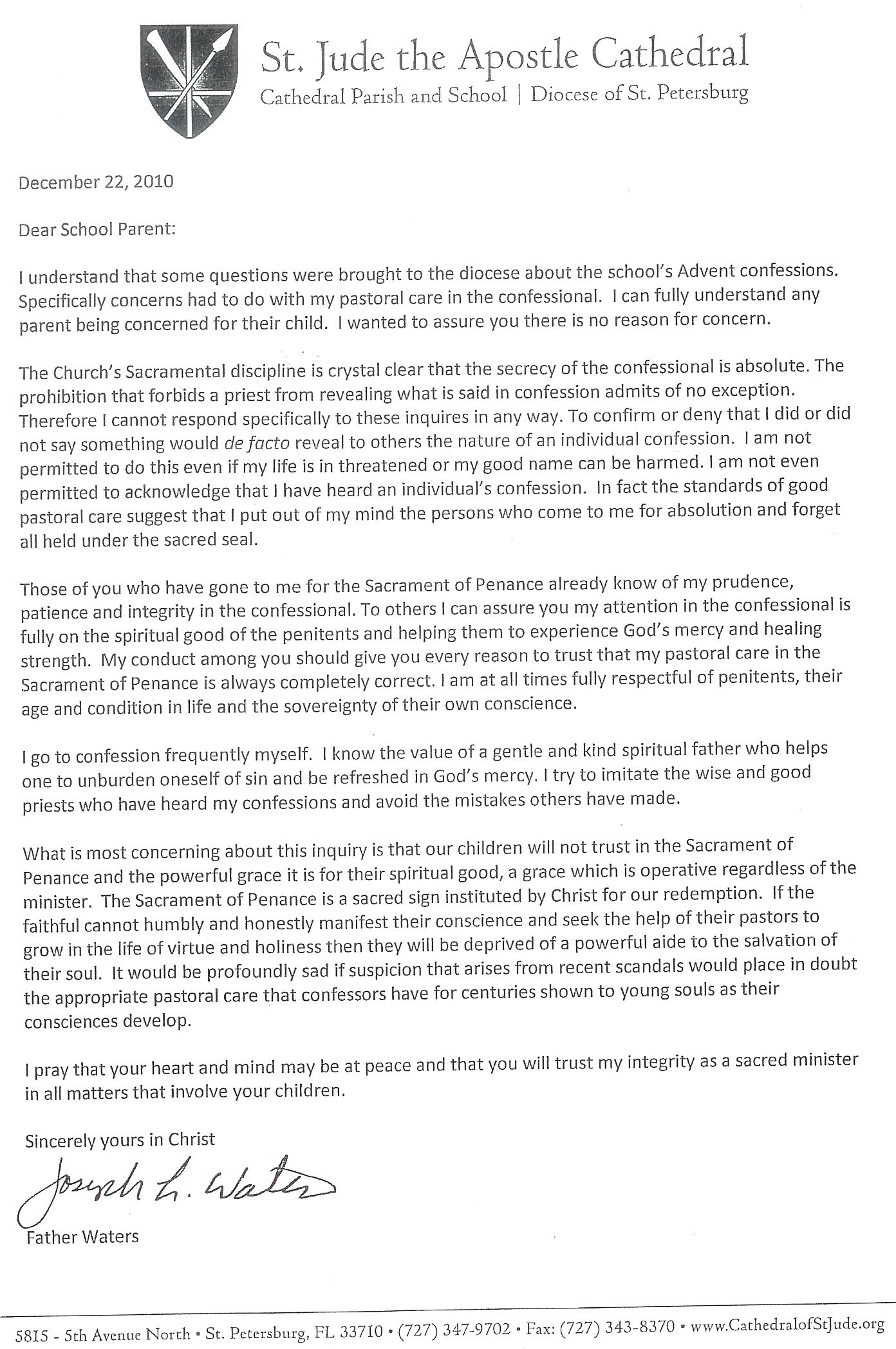 [Jan2011 Letter to parents from the Diocese of St. Pete] [Notary letter] St. Petersburg, Florida - In front of the Diocese of St. Petersburg headquarters, Martha Jean Lorenzo displays photos of young people from across the nation that she says were sexually abused by clergy. Lorenzo counts herself among the victims and she's a member of SNAP (The Survivors Network of those Abused by Priests), a national support group. SNAP works to publicize cases of sexual abuse and today Lorenzo outlined new allegations against a former Tampa priest Msgr. Norman Balthazar. Lorenzo says Catholic church leaders should have told people about a $75,000 settlement reached with a local man, who says Balthazar abused him when he was 17. "There was sexual abuse, absolutely-molestation," says Lorenzo, who has spoken with the man. Diocese spokesman Frank Murphy confirms the settlement, but says it in no way implies wrongdoing by Balthazar. He says the church did not inform parishioners about the settlement, because the allegations did not involve a child. Balthazar is now retired and lives in Massachusetts. 10 News tried to contact him by phone and left a message, but our call was not returned. However, Balthazar has been the subject of controversy before. In 1991, the priest was arrested during a Tampa Police sex sting. A judge later threw the case out. At the time, Balthazar told the media he was drunk and could not remember his actions. "I had too much to drink and was not in control of my senses," he said at a 1991 news conference. And the diocese is also dealing with another hot issue right now; this one involving students at the Cathedral School of St. Jude. Some parents of students there have big concerns about conversations Father Joseph Waters had with their kids in the confessional. One parent who didn't want to be identified told 10 News that the priest asked the young people if they touched themselves sexually or looked at computer porn. In a letter to parents, Father Waters writes, "I cannot say what happened in the confessional other than it was wholly appropriate...I have nothing for which to feel guilty or embarrassed." Waters goes on to say that the issues he asked about are "real spiritual challenges" for young people. And in a letter to parents the Vicar General, the Very Rev. Robert Morris writes that the diocese continues to have the "utmost confidence" in Father Waters. However, many people raised in the Catholic church tell 10 News that a priest asking those types of questions is unusual, if those subjects haven't been first brought up by the person confessing. And some parents are not satisfied with those responses from Waters and the diocese and activists like Lorenzo say they should continue to raise questions. Lorenzo says of the confession controversy, "It's business as usual; they don't have a good answer." |