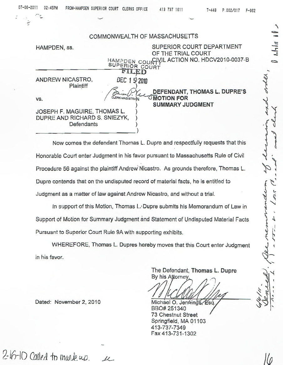 | Judge Rules Suit against Bishop Thomas L. Dupre and Bishop Emeritus Joseph F. Maguire Can Go Forward By Buffy Spencer The Republican June 10, 2011 http://www.masslive.com/news/index.ssf/2011/06/judge_rules_suit_against_bisho.html