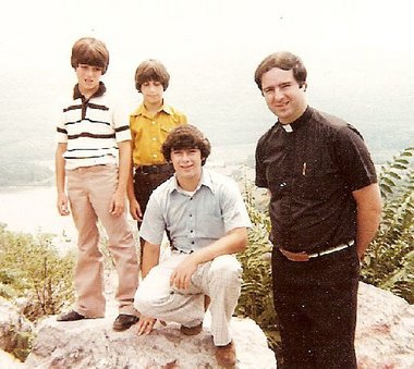 In this undated photo, Mark Crawford, center, is shown with Father Ken Martin, his alleged molester, and two of his younger brothers.
