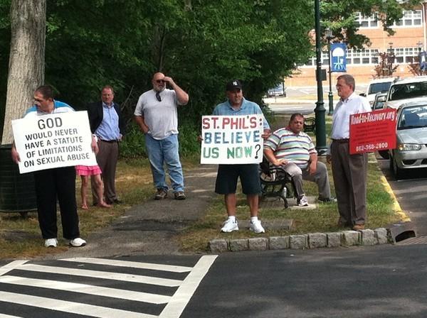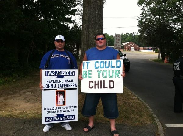 Just days after reaching a settlement with the Archdiocese of Newark, some of the men who allege that they were sexually abused by the Rev. John Laferrera as youngsters assembled outside St. Philomena Roman Catholic Church on Sunday to talk about the case.