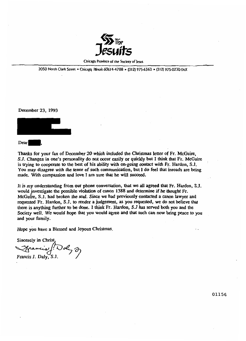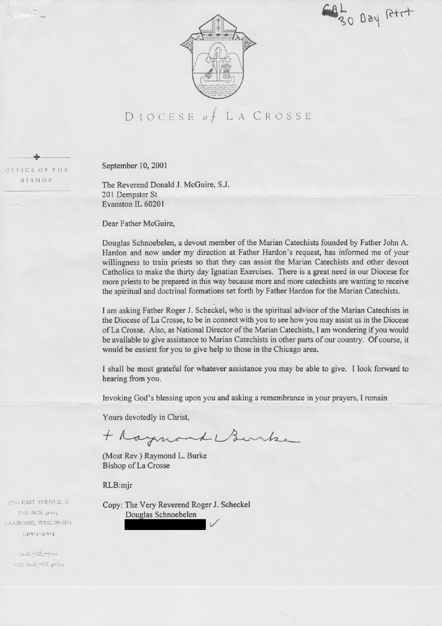 In September 2001, then Bishop Raymond Burke of the Diocese of La Crosse Wisconsin was shopping for a retreat master. He asked around and then remembered hearing a name from his good Jesuit friend John Hardon SJ (Burke later goes on to nominate Hardon for sainthood). The name he came across was Donald McGuire SJ of the Chicago Province of the Society of Jesus. He writes to McGuire, and McGuire accepts his invitation.