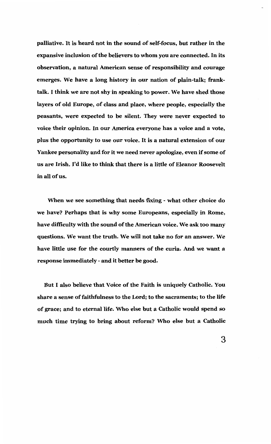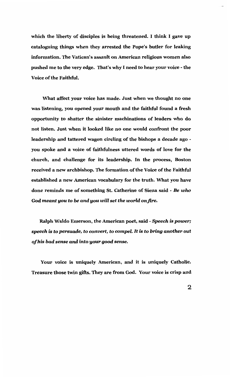 "So you are to me and to many priests the voice of the faithful, the voice of the brave, the voice of the trusting," he added. "I want to say this loud and clear: No matter what others might say, the Voice of the Faithful is a blessing to the church."