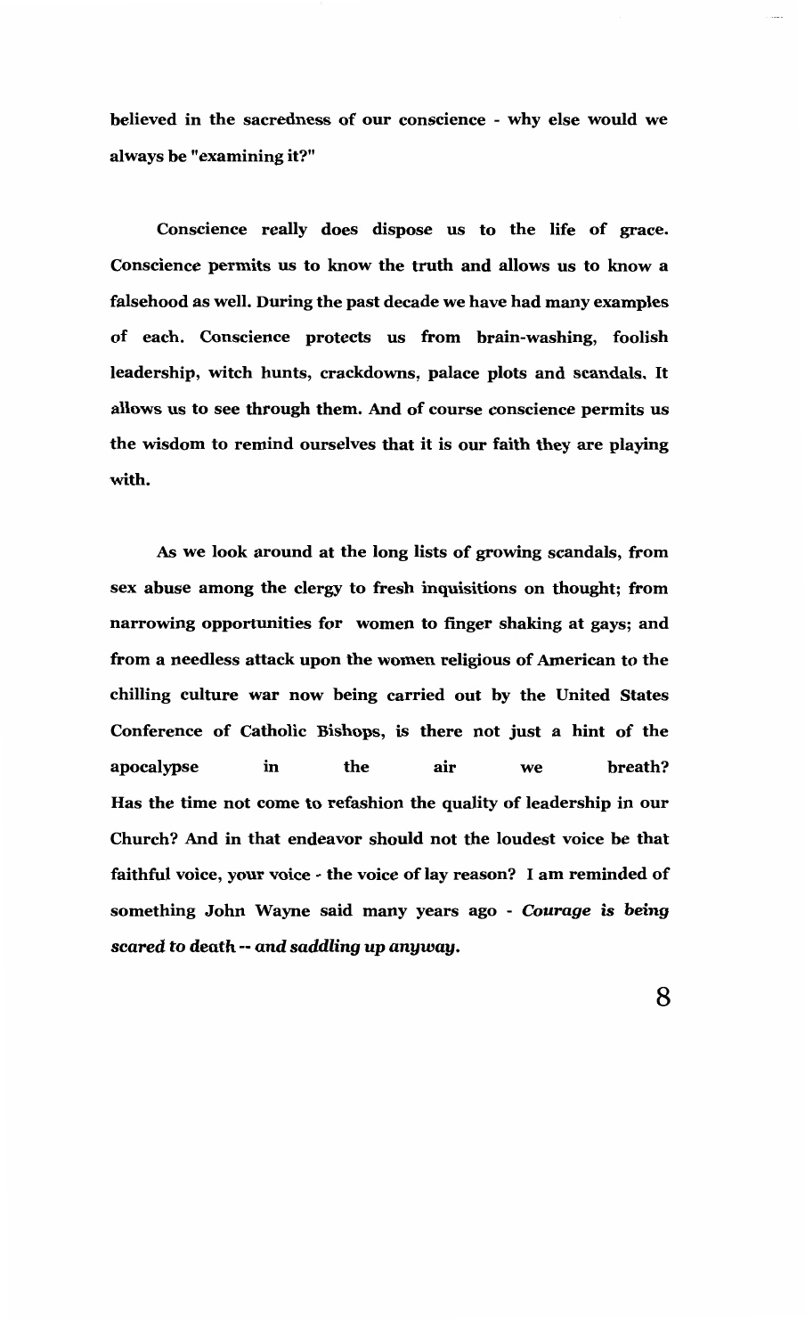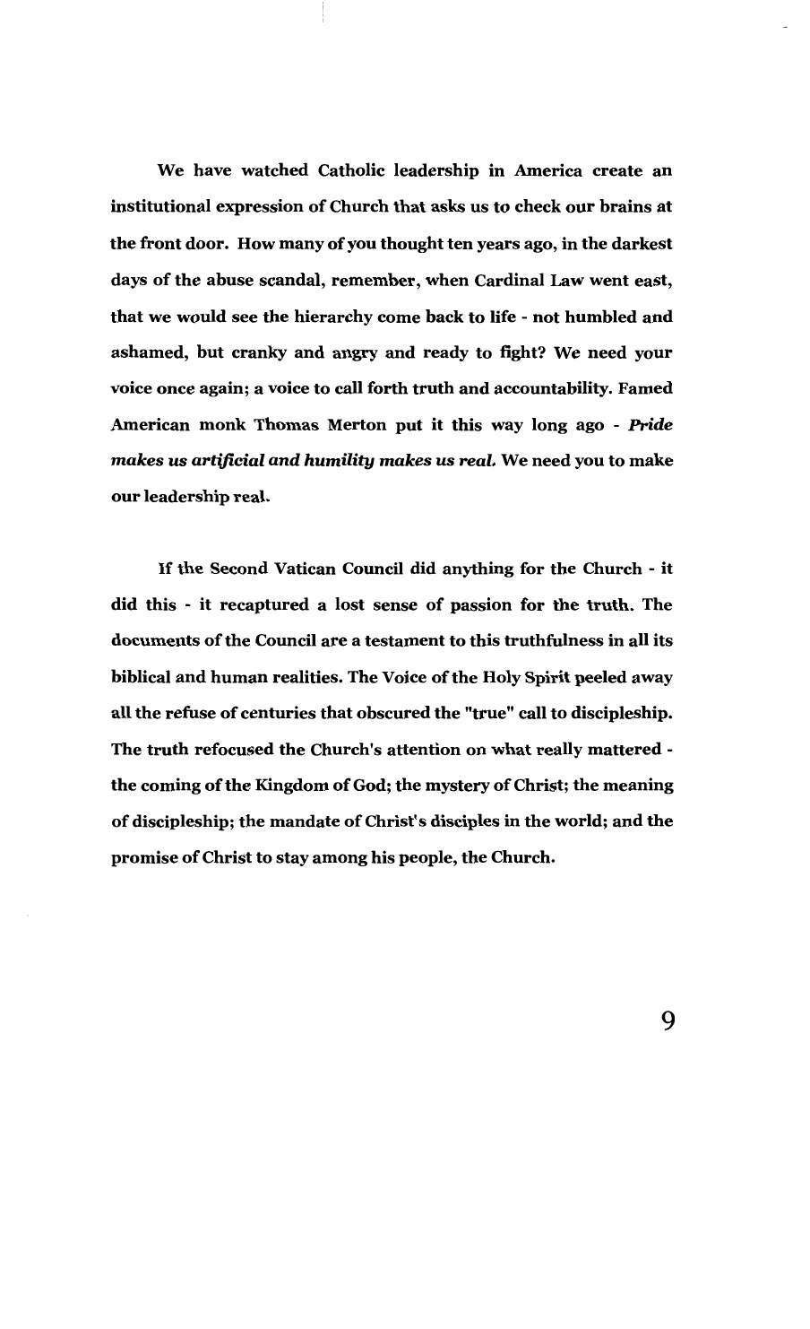 "You are the voice of the trusting," he told the gathering. "You trust that God's spirit will be with our brothers and sisters wounded by priests and bishops. And you trust that the spirit will be with our wounded church, even in the present darkness. You trust that it is necessary, absolutely necessary, to speak your truth to power, to speak words of healing and compassion to the thousands upon thousands who have been sexually exploited by the officers and ministers of the church, and to hold the church to the teachings and vision of the Second Vatican Council.