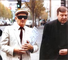 Father Ridsdale (with his features obscured by dark glasses and a cap) walked to the Melbourne Magistrates Court with his support person, Bishop Pell (wearing clerical garb).