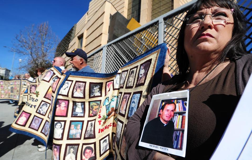 Victims and supporters held quilts with portraits of abused children outside the Cathedral of Our Lady of the Angels.