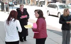 A passerby (L) receives literature and information from (L-R) Dr. Rosemary McHugh, Kate Bochte and Barbara Blaine in front of Holy Name Cathedral Sunday