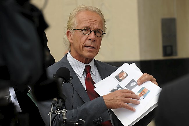 Attorney Jeff Anderson speaks at a news conference outside the Ramsey County Courthouse in St. Paul, on Monday, August 4 , 2014. Anderson holds a sheet with photos of five out of the eight New Ulm Diocese priests accused of sexual misconduct. (Pioneer Press: Scott Takushi)
