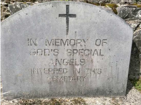 In the early 1990s (at about the same time as the Irish public was learning about the child abuse scandals and the horror of the Industrial schools), the Sacred Heart nuns sent money to the Department of Health staff running Castlepollard, to have the Angels’ Plot cleaned up. They also arranged for a small memorial stone to be erected. It is made of cheap limestone, weathers badly and the last word on the stone ‘cemetery’, is misspelled as ‘cemetary’.