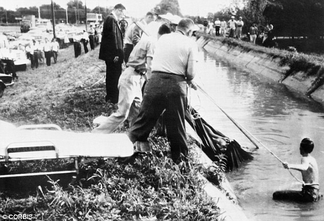 Deputy Sheriffs and volunteer workers remove the burlap wrapped body of 25-year-old Garza from an irrigation canal near the heart of McAllen