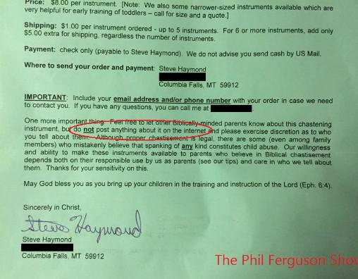 “Feel free to let other Biblically-minded parents know about this chastening instrument, but do not post anything about it on the internet and please exercise discretion as to who you tell about them,” the letter read. “Although proper chastisement is legal, there are some (even among family members) who mistakenly believe that spanking of any kind constitutes child abuse. Our willingness and ability to make these instruments available to parents who believe in Biblical chastisement depends both on their responsible use by us as parents (see our tips) and care in who we tell about them. Thanks for your sensitivity on this.”