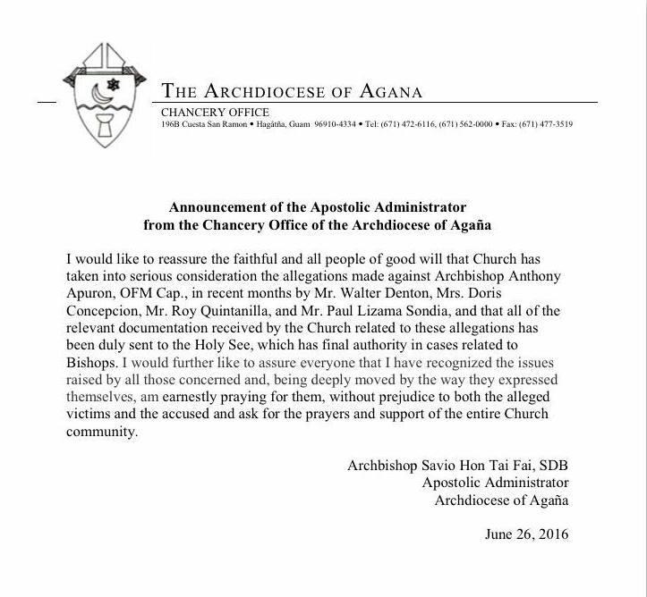 "I would like to reassure the faithful and all people of good will that Church has taken into serious consideration the allegations made against Archbishop Anthony Apuron, OFM Cap., in recent months by Mr. Walter Denton, Mrs. Doris Concepcion, Mr. Roy Quintanilla, and Mr. Paul Lizama Sondia, and that all of the relevant documentation received by the Church related to these allegations has been duly sent to the Holy See, which has final authority in cases related to Bishops. I would further like to assure everyone that I have recognized the issues raised by all those concerned and, being deeply moved by the way they expressed themselves, am earnestly praying for them, without prejudice to both the alleged victims and the accused and ask for the prayers and support of the entire Church community."