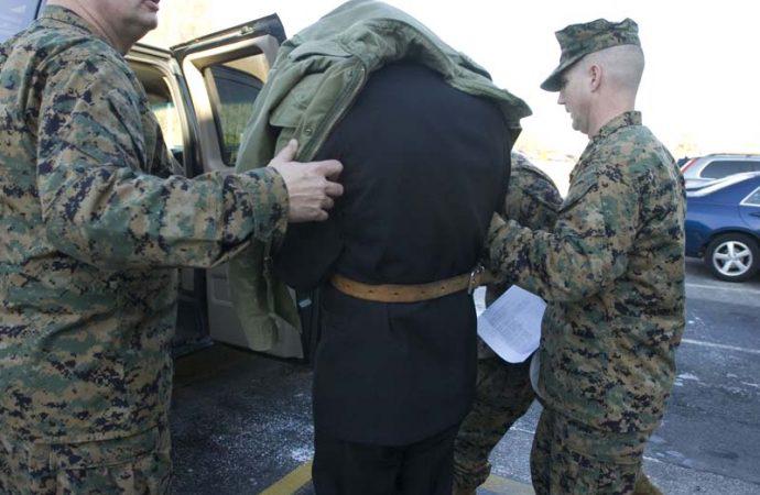 His face covered with a jacket, former US Navy Lt. Commander John Thomas Lee, a chaplain, is escorted out of a courtroom in 2007, at Marine Corps Base Quantico in Virginia. Photo by M. Scott Mahaskey |