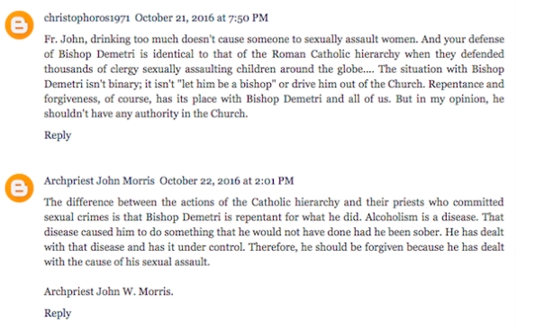 In the comments section of that posting (on an Orthodox blog), a sharp dispute has arisen between critics of this move by the Metropolitan, and Archpriest John Morris, a staunch clerical defender of the disgraced bishop, who chides the critics: