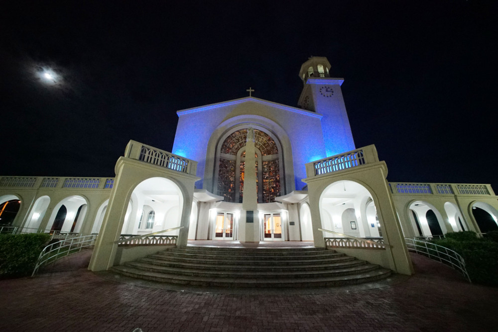 The moon sets over the Dulce Nombre de Maria Cathedral Basilica in Hagatna, Guam before a 5:45 a.m. Chamorro Sunday morning Mass. (Honolulu Civil Beat/Cory Lum)
