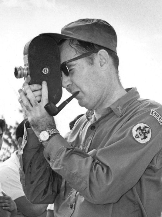 In this Pacific Daily News file photo dated Aug. 15, 1965, Louis Brouillard is shown filming footage in an outdoor setting. In the full frame of the picture, which is cropped, boys, some in Boy Scouts uniforms, stand around Brouillard.