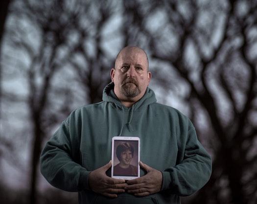 “First there was the sex abuse. Then years of coverup. Then the archdiocese fought against us in the Legislature. Now it’s three years with no settlement. What kind of message does that send?” said David Lind, with a photo of himself at 14. Photo by Jerry Holt |