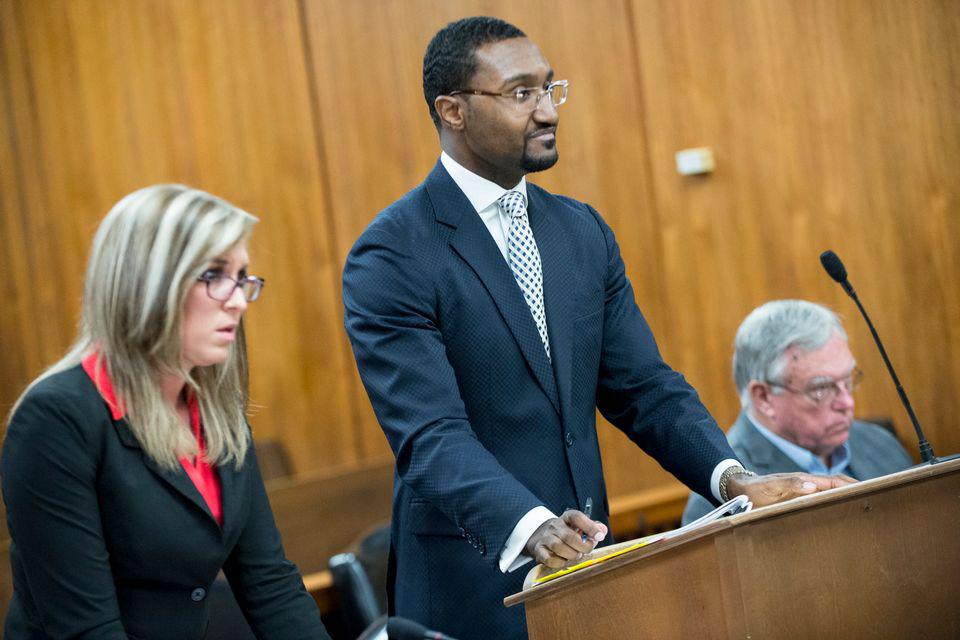 Attorney Alan Crawford gives a statement on behalf of his client, the Rev. Robert J. "Father Bob" Deland, Jr., during a preliminary examination for Deland before Saginaw County District Judge David D. Hoffman on April 25, 2018. Deland is charged with attempted second degree criminal sexual conduct and one count of gross indecency between males. Photo by Jacob Hamilton |