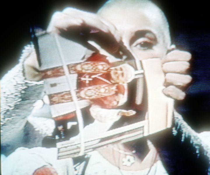 While chanting the word “evil,” O’Connor holds up a photograph of Pope John Paul II and rips it in half, then into pieces, then tosses the pieces at the camera and says, “Fight the real enemy!”