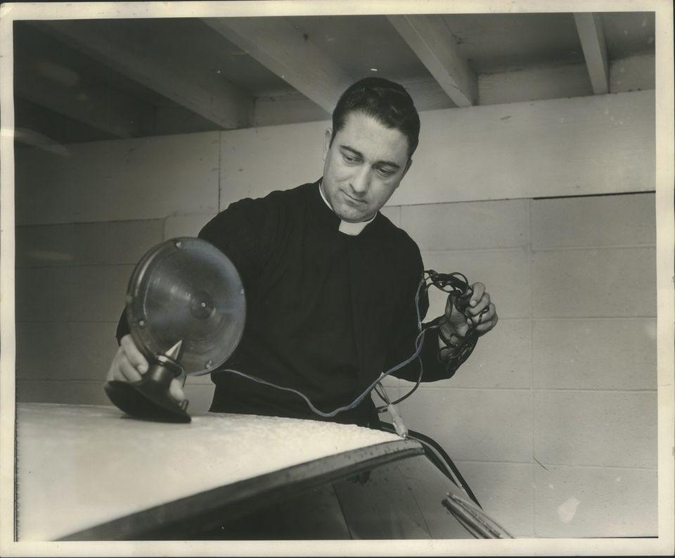 | Father Louis LeBourgeois, who was a member of a Jefferson Parish volunteer fire fighting company, installs a light on his vehicle in this 1963 file photo. |