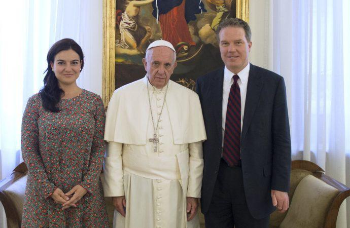 Pope Francis poses for a family picture with Greg Burke and Paloma Garcia Ovejero at the Vatican, Monday, July 11, 2016. Photo by L'Osservatore Romano |