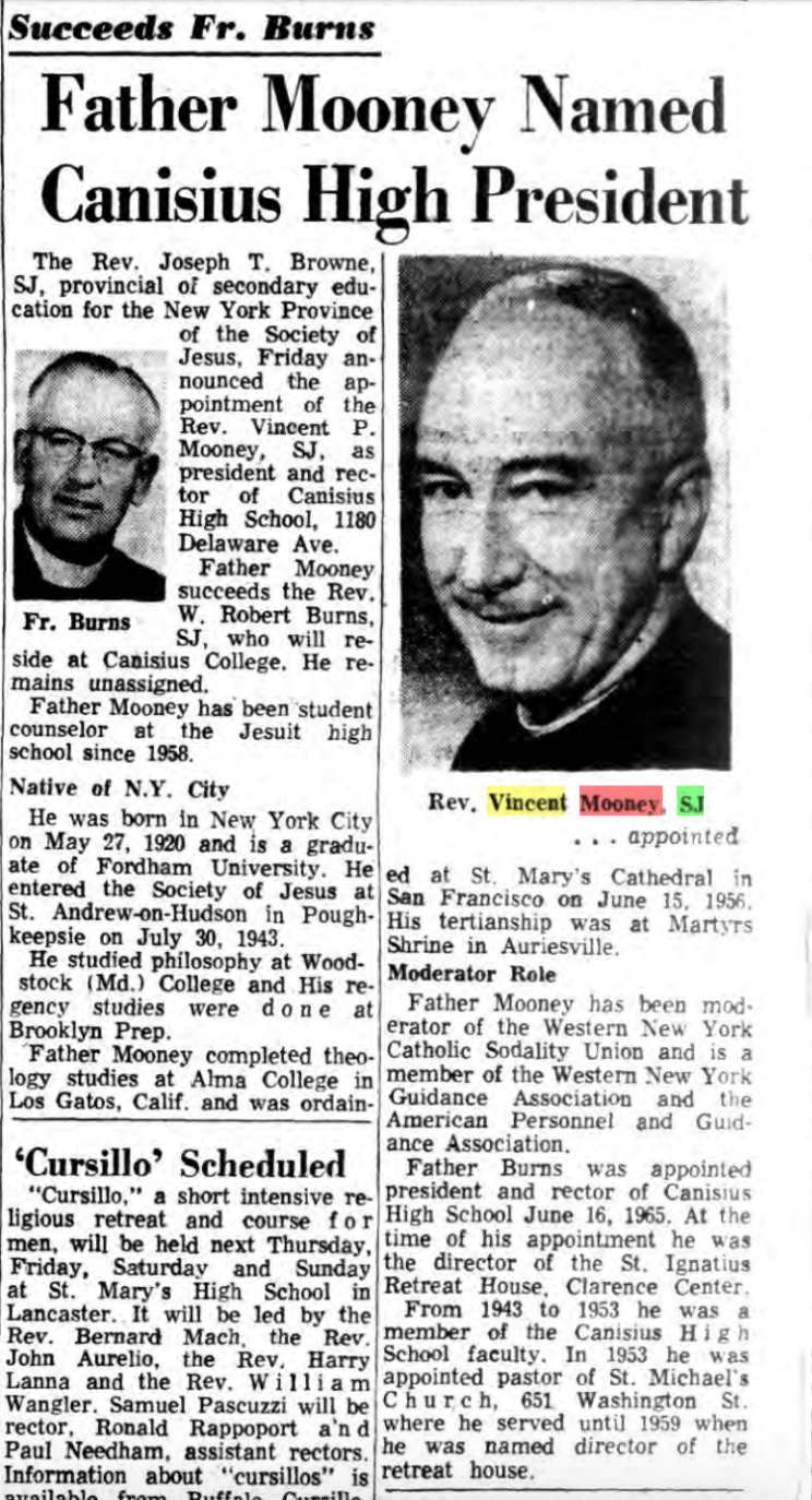 Church records show Mooney served at Canisius from 1958-75 and was appointed president and rector in 1968, according to church records and archives of the Buffalo Courier-Express. He was the moderator of the Western New York Sodality Union, a role that allowed him to lead retreats for young women, according to news articles.