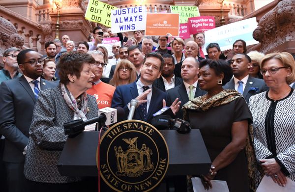 Manlius native Kevin Braney, at center in the crowd, is pictured with New York state legislators including Sen. Brad Hoylman, D-Manhattan, former Assemblywoman Margaret Markey, and Senate Majority Leader, Andrea Stewart-Cousins, D-Yonkers, who supported and passed the Child Victims Act in January. Gov. Andrew Cuomo signed the legislation into law today. (Hans Pennink)