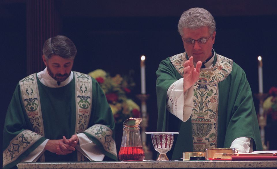 Rev. Paul Angelicchio is pictured at right in this 2003 file photo taken during mass at Holy Family Church in Syracuse.