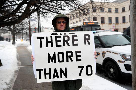 Robert Hoatson, co-founder and president of Road to Recovery, holds a sign reading "there are more than 70" in reference to sexual abuse cases against New Jersey priests, as the Archdiocese of Newark holds a meeting regarding this list of abusive priests on Tuesday, Feb. 12, 2019. Photo by Danielle Parhizkaran |