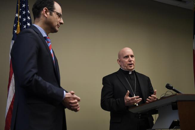 Archbishop Samuel Aquila speaks on Feb. 19 in Denver as Colorado Attorney General Phil Weiser stands by during a press conference to address sexual abuse in the Catholic Church. Photo by AAron Ontiveroz |