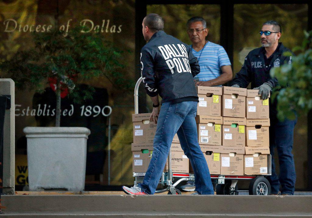 Dallas police officials cart out boxes from a raid on the Catholic Diocese of Dallas, Wednesday, May 15, 2019. Dallas police officers on Wednesday morning raided several Dallas Catholic Diocese offices after a detective said church officials have not cooperated with investigations into sexual abuse by its past clergy members. The investigation is stalled while attorneys for the city of Dallas and the Diocese sort through documents to determine what records the detective should have. Photo by Tom Fox |