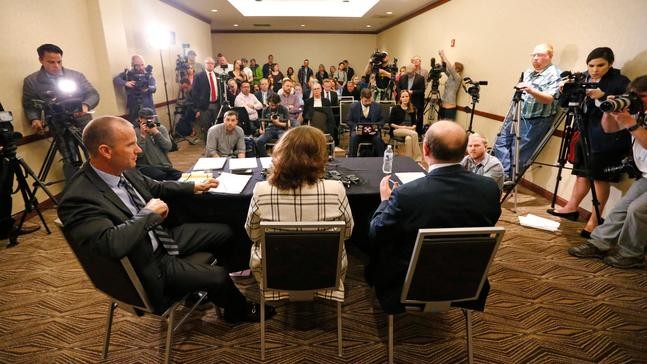 McKenna Denson, center, speaks with reporters during a news conference Thursday, April 5, 2018, in Salt Lake City. Denson, who accused a former LDS missionary training center director of raping her in the 1980s and the church of failing to take her allegations seriously, has sued the man and the church in a move that could bring more scrutiny to the religion's handling of sexual abuse reports. (AP Photo/Rick Bowmer)