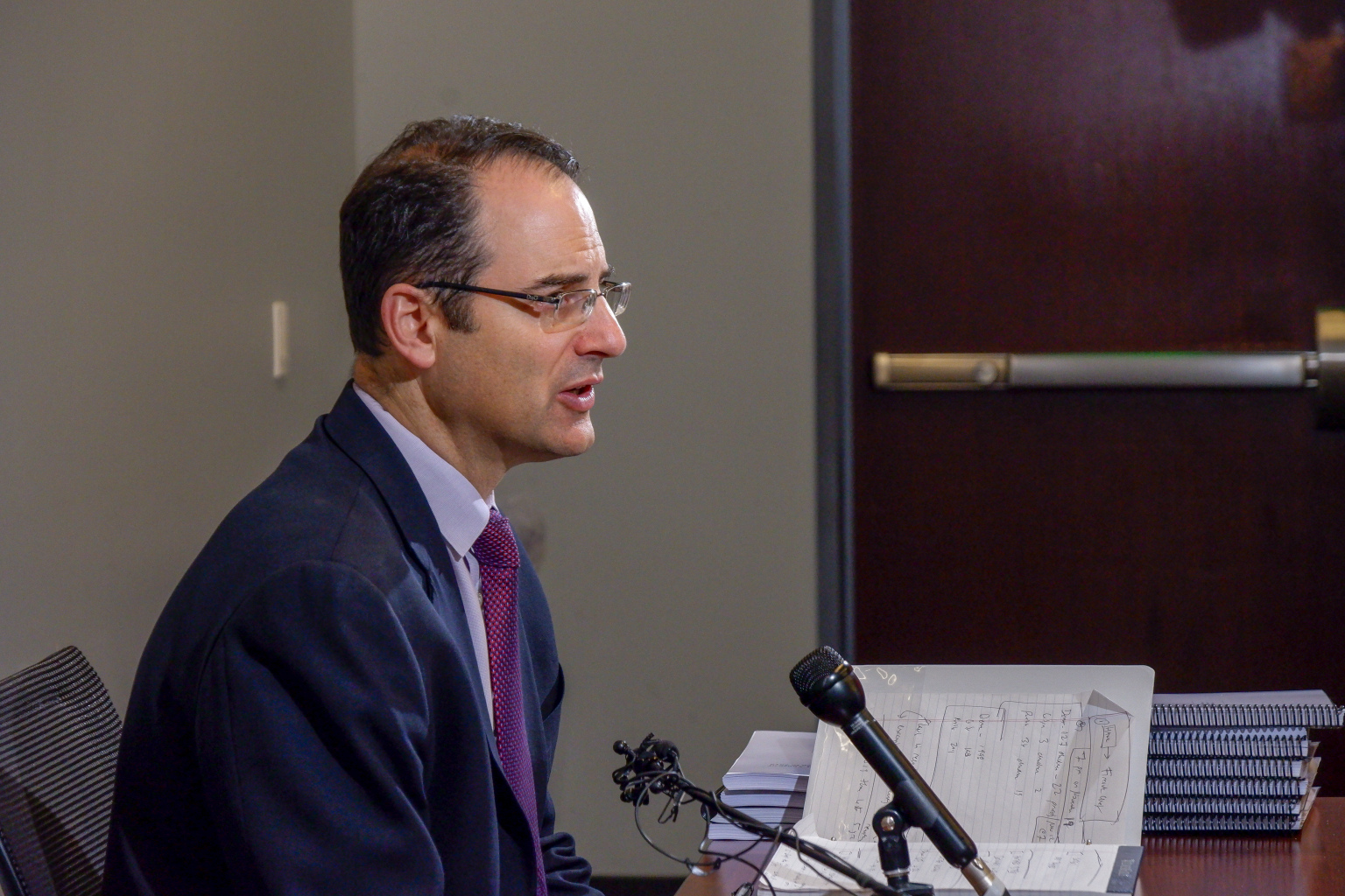 Colorado Attorney General Phil Weiser speaks to reporters on Wednesday, Oct. 23, 2019, about a report on priest abuse in Colorado. (Jesse Paul, The Colorado Sun)