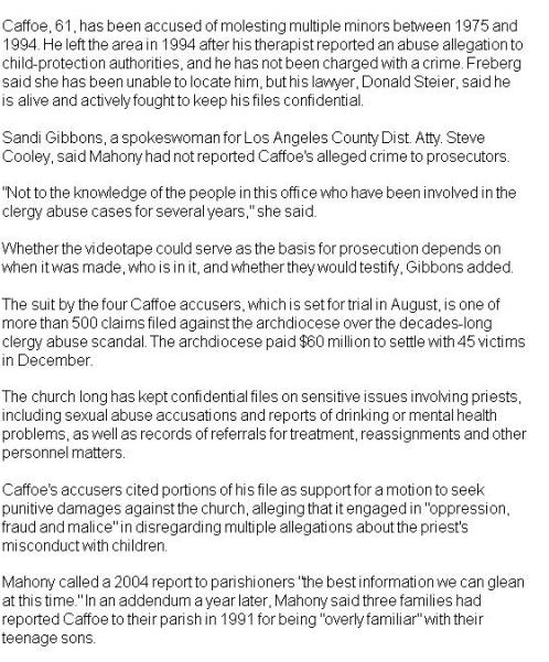 and Reluctant Revelation in the Los Angeles Archdiocese The Example of the Rev. Lynn Caffoe File In the Archdiocese of Los Angeles under Cardinal Roger Mahony, claims of transparency and complete openness have gone hand-in-hand with secrecy, partial releases of information, and steadfast refusal to open the files. The Rev. Lynn Caffoe is a case in point. On this page, we first describe the evolution of the public's knowledge about the Caffoe allegations. Then we provide the archdiocesan reports themselves, color-coded to show what was missing at various stages. The public at large first learned that Caffoe was an accused priest when the Los Angeles Times published a major Sunday report, Archdiocese for Years Kept Allegations of Abuse from Police, by Glenn F. Bunting, Ralph Frammolino, and Richard Winton, on August 18, 2002. Ten years after Caffoe had been placed on inactive leave in 1992 because of abuse allegations, the public finally learned that Caffoe had been accused and removed. The Times reported a single allegation against Caffoe. That was by no means the whole story. The archdiocese posted its Report to the People of God in February 2004. Many dioceses published similar reports, as part of the USCCB-sponsored study of the abuse crisis by the John Jay College of Criminal Justice. In the Report to the People of God, the number of Caffoe's accusers was raised to three, and a brief paragraph described two of the allegations. An enclosed letter over Mahony's signature described the report as the "fullest possible disclosure." But in October-November 2005, the archdiocese released an Addendum to the Report to the People of God. The Addendum provided "underlying information" prepared by the archdiocese's lawyers from descriptions (so-called proffers) of the archdiocesan files that the court had verified were "complete and accurate." The Addendum was intended to further the Archdiocese's "commitment to speak honestly and openly." Both the 2004 Report and the 2005 Addendum were based on the same archdiocesan files, but the Addendum painted a very different picture of the Caffoe allegations. Now the archdiocese counted not three but at least 15 accusers, and described many allegations not included in the previous year's Report. Some of the discrepancies between the Report and the Addendum were detailed by the Los Angeles Times in Details on 11 Priests Missing in '04 Report: Mahony's Disclosure on Sex Abuse Claims Left out Information on Clerics Who Stayed in Ministry, by Jean Guccione and William Lobdell, on April 20, 2006. But then the Los Angeles Times reported on Caffoe litigation in Mahony Accounts of Abuse Case Tape Differ: Plaintiffs Say He Gave the Vatican a Graver Version of Priest's Role Than He Gave the Public, by John Spano, on March 20, 2007, and the archdiocese replied. The Spano article provided the public with its first quotations from actual documents in the much-contested Caffoe file. When these quotations were compared with the paraphrases in the 2005 Addendum, it became clear that the Addendum had not represented the Caffoe file accurately. "Partially naked" boys in a letter from Mahony to Cardinal Ratzinger requesting Caffoe's laicization became "fully clothed" in the Addendum. "Criminal behavior" in the Ratzinger letter was referred to as "no sexual activity." Hugging and fondling had been rendered in the Addendum as "inappropriate behavior." And so forth. Below we reproduce: 1) the Caffoe-related portions of the 2004 Report to the People of God, 2) the Caffoe-related portions of the 2005 Addendum to the Report, and 3) the 2007 article on the Caffoe litigation. The color-coding shows the discrepancies: A) The Report counted 3 Caffoe accusers. The Addendum described at least 15. These totals are marked with blue lines. B) The Report's brief descriptions of a few Caffoe allegations are underlined in green, as are the corresponding passages in the Addendum. The additional descriptions of allegations in the Addendum are underlined in red. These allegations were not included in the original Report. C) The Addendum purported to describe documents from the Caffoe file. But the Addendum's descriptions of abuse-related documents from the file are not consistent with the quotations from those documents in the Caffoe litigation. A purple line marks the entries in the Addendum and the comparable quotations in the Los Angeles Times article about the litigation, and a bold number allows you to match the entry with the quotation. For other problems with the Addendum, see our brief essay with links: How Complete Are the Personnel Summaries in the Addendum? 1) REPORT TO THE PEOPLE OF GOD: