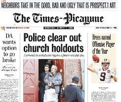 two Uptown Catholic churches http://www.nola.com/news/t-p/index.ssf?/base/news-1/1231309451208240.xml&coll=1 [Note from BishopAccountability.org: Captions of the first two photographs were transcribed from a PDF of the Times-Picayune front page. See also a statement by the archdiocese. The Friends of Our Lady of Good Counsel may be contacted at ourladygoodcounsel@gmail.com.] New Orleans police evicted parishioners from two Uptown Catholic churches Tuesday and delivered the buildings back into the hands of the Archdiocese of New Orleans, apparently ending a 72-day standoff that began when parishioners moved into the churches and occupied them around the clock to save them from closure. Accompanied by lawyers from the city attorney's office, police arrived almost simultaneously at Our Lady of Good Counsel on Louisiana Avenue and at St. Henry Church, about a mile away on Gen. Pershing Street, around 10:30 a.m. People at St. Henry said police knocked at the locked door, were allowed entry and told three protesting parishioners to leave or face a civil summons or arrest. Among the three was Madeline Morris, the widow of former Police Superintendent Henry Morris, said Alden Hagardorn, a St. Henry leader.